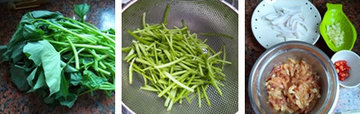 主料:番薯苗600克,瘦肉120克,小红椒3根,大蒜10克,洋葱30克