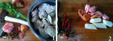 配料:泡椒4个,泡姜一块,泡蒜一头,花椒一小把,大葱一段,八角两个,桂皮一段,香叶三片,自制麻辣红油适量,生抽适量,米醋适量,料酒适量
