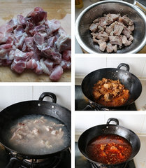 2、锅里放入适量植物油,放入姜片爆一下锅,倒入排骨炒干水汽。放入郫县豆瓣酱和麦酱(或面酱),炒得排骨吐红油,。加入适量水分、少许盐、三萘,高压锅烧开后,中火嗤15-18分钟。关火。