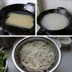 5、水烧开后煮五六分钟左右,米粉变柔软后,关火,再泡5分钟左右。将米粉捞出,用清水反复冲洗至水清不浑浊,待用。