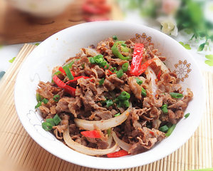 主料:肥牛卷250克,洋葱适量,青椒1个,红线椒1个,生姜丝适量,大蒜1瓣,香葱碎适量