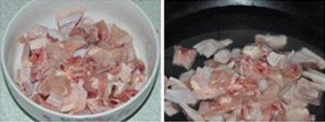 4、锅内水烧开后将鸡块捞出,用冷水冲去浮沫,沥干水分备用。