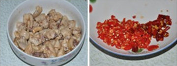6、干辣椒切段,取一半小米椒剁碎。(小米椒剁碎后会增加菜的辣度,也可以省略这步)。