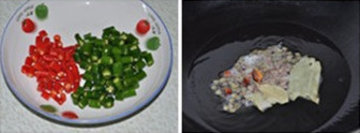 8、锅内放油烧至六成热后,放入八角、麻椒和香叶爆出香味。