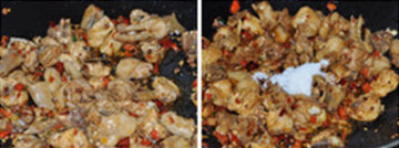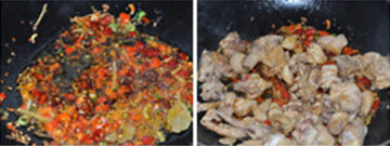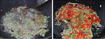 10、加入干辣椒段和剁碎的小米椒翻炒均匀。