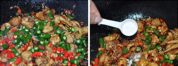 15、继续大火爆炒至鸡肉将熟后翻入杭椒和小米椒段翻炒至辣椒断生。