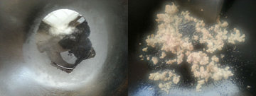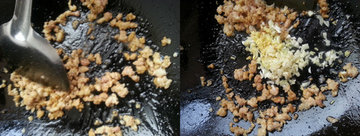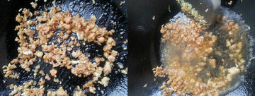 9、肉末变色时,加入生抽、料酒,炒匀。