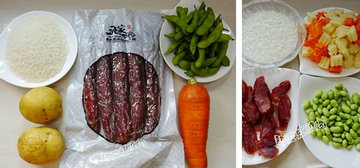 1、准备好食材:大米、腊肠、土豆、胡萝卜、毛豆。