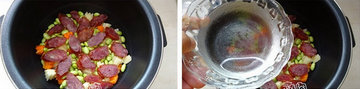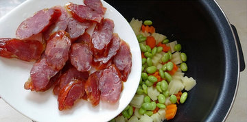 2、大米洗净、香肠清洗一下切片、土豆胡萝卜洗干净切丁、毛豆去皮洗净备用。