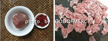 1、准备猪里脊肉250克。新鲜枸杞或者【干枸杞】用水冲洗干净后在沸水中焯一下,过凉待用。