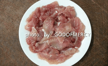 2、将猪里脊肉平铺砧板切成片待用。