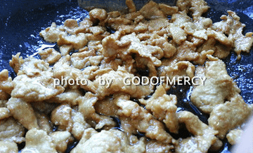 8、油热后下肉片滑散。肉片炒到划散变色4成熟时捞出沥干油。