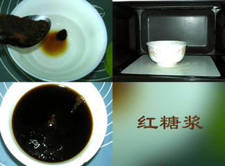 2、将水倒入碗中,加入红糖。放入微波炉加热至红糖溶化,其间不时取出搅拌。成浓稠红糖浆。
