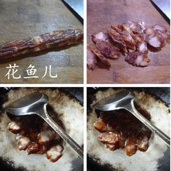 4、烧锅倒油烧热,下入切好的麻辣香肠翻炒翻炒。