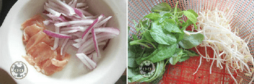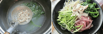 7、豆芽、青菜、肉片分别烫熟,放在米粉上。