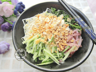 主料:干米粉,青瓜,洋葱,猪肉片,豆芽,绿叶青菜,炒花生米