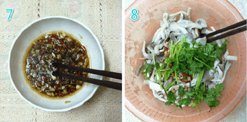配料:生姜1片,芝麻香油1大勺,陈醋3大勺,鸡精少许,盐少许,白糖少许