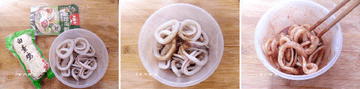 1、备好食材,鱿鱼处理好切圈,放入碗中,加上糖醋辣酱、烧烤汁搅拌均匀,腌制30分钟以上。