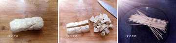 2、素鸡拆开包装,冲洗一下,竖着切十字刀,再切大粒,竹签放入锅中烧开水消毒片刻。