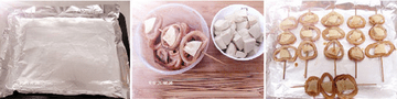 3、烤盘上铺上锡纸,涂抹一层食用油,鱿鱼圈和素鸡串好,鱿鱼圈中间刚好可以串上一块素鸡,利用空间之余还互相渗透美味,整齐铺在烤盘上。