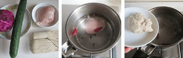 2、就着焯过鸡肉的水, 将豆皮丝也焯熟, 再过凉开水,准备好其它的配菜, 都切成细丝。