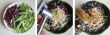 8、将浸泡冷水的豆皮丝放入碗底, 上面码上黄瓜和紫甘蓝丝, 再放入挤压出来的蒜泥。