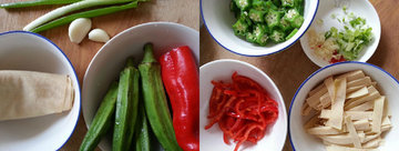 1、原料:豆皮,秋葵,红椒,蒜,葱。