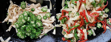 5、加入秋葵,翻炒,加入生抽,盐,花椒粉,翻炒均匀。