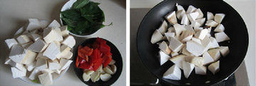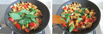 3、九层塔是三杯菜中重要的原料, 有股特殊的香味, 必不可少, 只需最后放入, 翻炒变色即可。