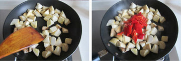 2、炒制时要先将杏鲍菇煸炒至表面发黄体积缩小, 这样才有利于放入三杯调味料后吸收其汤汁。