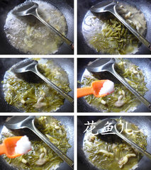 3、接着,合入切好的雪菜煮开、煮上2分钟。