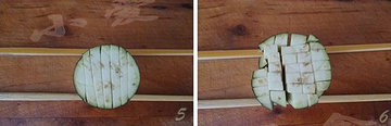 6、将茄子转90度,按“十字花刀”法,切成如图的样子。