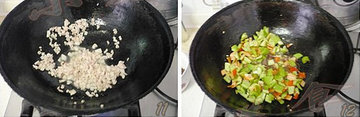 11、炒锅中加油放肉馅煸炒加料酒炒出香味。