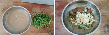 14、调开的芝麻酱中加香葱、香菜、蒜末。