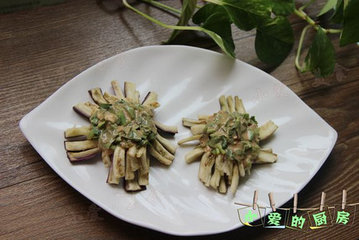16、、将蒸好的茄子小心移入盘中,摆好造型,舀一勺调好的麻酱分别放在茄子花的中心即可。