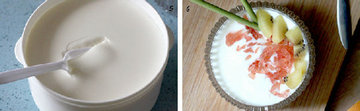 6、各式水果取果肉,然后放入酸奶中,吃时混合均匀即可。