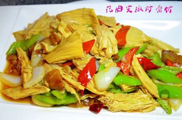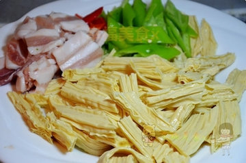 主料:猪五花肉150克,浸泡好的腐竹400克,青红尖椒50克,圆葱50克,葱片10克