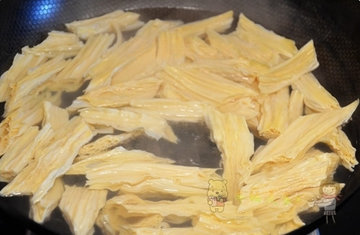 3、锅内加水烧开,将腐竹段放入飞一下水捞出控水。
