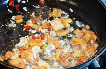4、炒锅烧热加入花生油,加入五花肉片,煸至出油,将多余的油取出。
