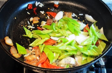 5、加入干辣椒节和大葱片爆香,加入青尖椒片和圆葱片煸炒。