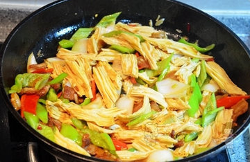 6、下酱油炝炒,加腐竹,调入蚝油翻炒入味,淋香油出锅即可。