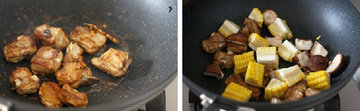8、加入处理好的玉米和香菇,翻炒均匀。