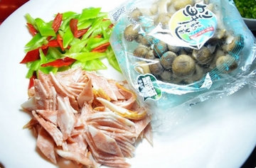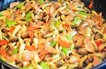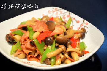 主料:蟹味菇2小包,培根片50克,青红尖椒各30克,葱姜蒜片各5克