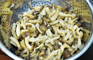 2、蟹味菇剪掉根蒂,入开水锅中飞水后捞出控干水分。