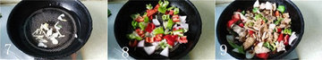 8、放入青红椒、洋葱翻炒至断生。