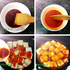 2、糖醋辣酱倒进碗里,加适量清水调匀,倒入1汤匙蚝油、少许鸡粉、搅拌均匀,淋在煎好的豆腐上面,端起平底锅轻轻摇晃片刻,让每一块豆腐粘上酱汁,关火铲起,撒点葱花即可。
