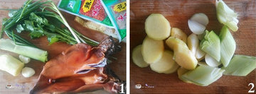 2、生姜切成片,大葱切成段,将两瓣大蒜切成片。