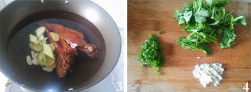 4、香菜切成小段,小葱葱头部分切成小段,葱叶部分切成末,剩下的一瓣大蒜切成末。