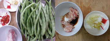 1、原料:芸豆、五花肉、干辣椒碎、姜、蒜。