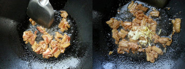 6、肉变色时,加入蒜碎、姜丝,炒香。
